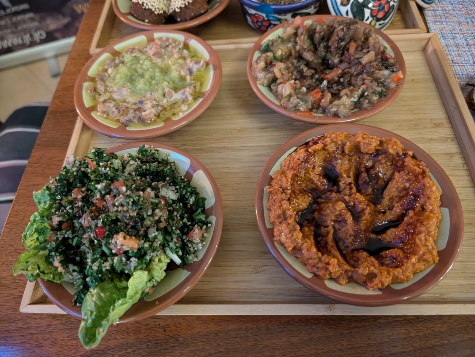 The plate continues with foul, baba ganoush, walnut dip, and tabbouleh. The foul is the only warm element besides the falafel, and it’s tasty. The baba ganoush is good, on the right side of that bitter taste you sometimes get. The walnut dip has real depth of flavour. The tabbouleh is a bit too herby for me, though that’s a complaint I have about all tabbouleh.